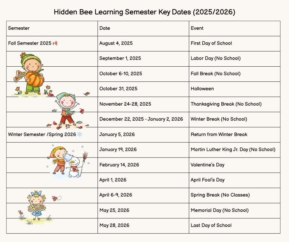 This calendar reflects the official schedule for 2025–2026 and is provided as a reference for families who would like to review past program dates and structure.